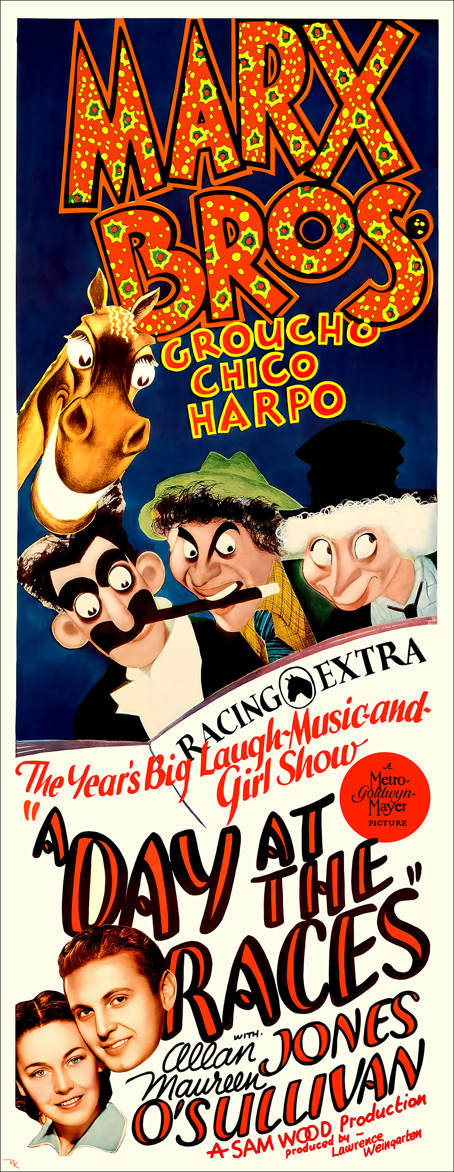Our restored poster for the Marx Brothers’ madcap masterpiece “A Day at the Races” brings the infectious comedy of Groucho, Chico, and Harpo to life with dazzling clarity. This poster captures the sheer joy, energy, and lunacy that only the Marx Brothers could deliver, presenting a lively visual echo of one of their most beloved films. The original poster art radiates with the same unstoppable energy.