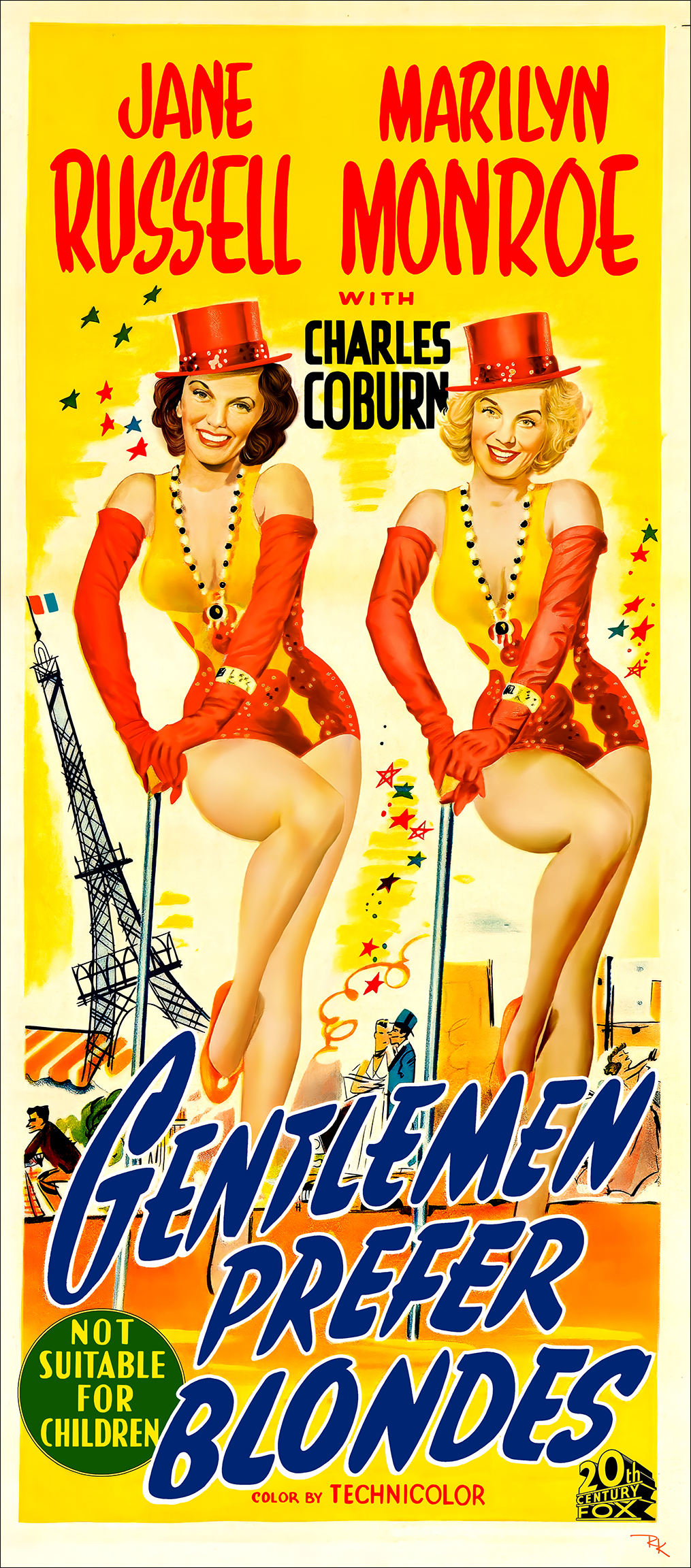Our restored poster for “Gentlemen Prefer Blondes” brings back the glitz, glamour, and irresistible allure of one of Hollywood’s most iconic musicals. With Marilyn Monroe and Jane Russell side by side in a whirl of diamonds, feathers, and flirtation, this vintage gem captures the high style and sparkling wit of a true Golden Age classic.
